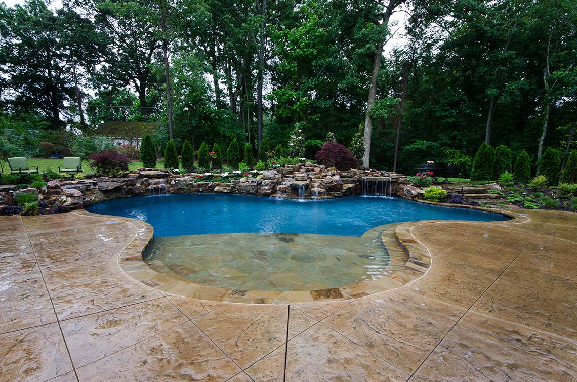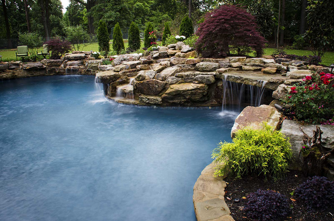 After several months of designing, meetings and more design time, the final master plan was complete. Included in this master plan were: a natural inviting design for vehicular access for the residents, guest parking with easy accessibility to the front entry, a well defined front entry, retaining walls to protect the wooded vegetation while still allowing the space needed for vehicular access, lush natural landscaping, irritation system for the entire property and elegant landscape lighting….and this was just the front yard. In the backyard, the design was to incorporate the natural topography of the site and include a custom pool with waterfalls (6 in total to be exact), plenty of pool deck area for entertaining, a private overlook bistro patio, plenty of rich green lawn space for the kids (their two black labs) and the grandchildren. The plan was also to include a grand entry into the landscape that had plenty of wow factor yet remaining in balance to the properties natural environment. Elegant landscape lighting brings this backyard paradise to life in the evening hours making this backyard the perfect outdoor entertainment location.