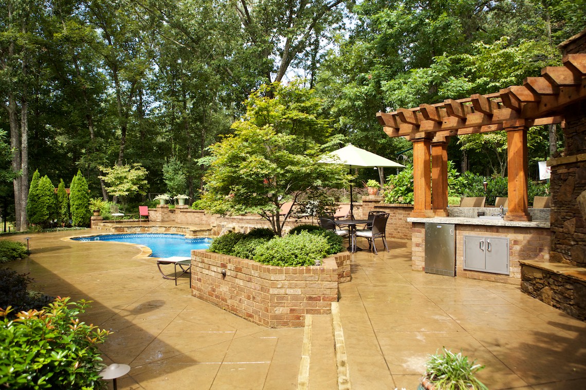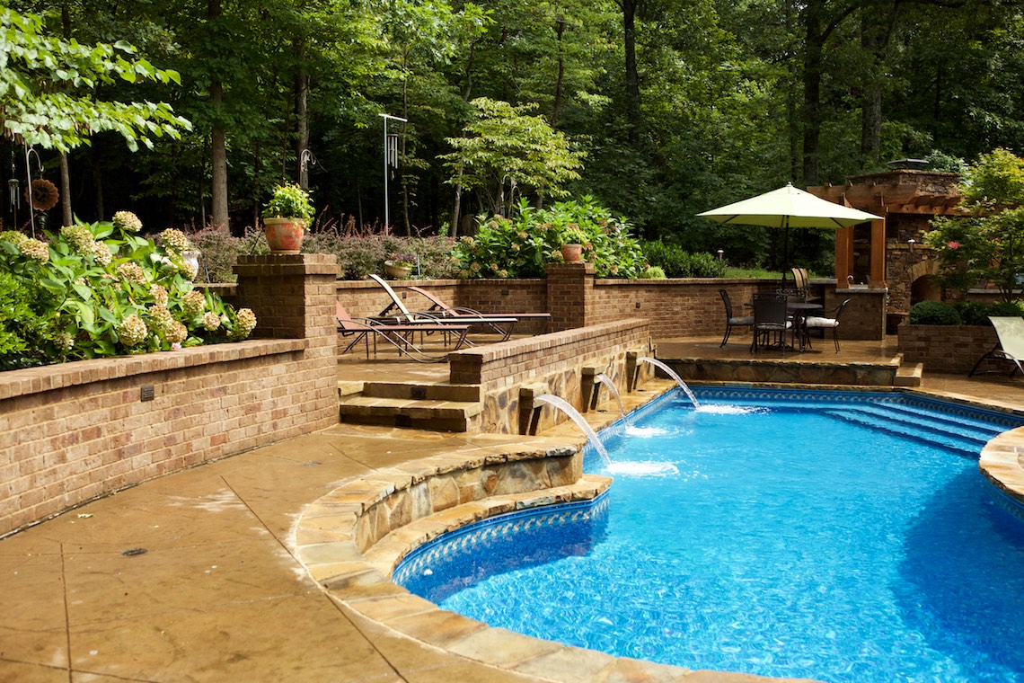 Located in a private rural area of Nesbit, Ms, this project is a perfect example of implementing a Master Plan over a period of phases. This project also provides an excellent example of maximizing one’s budget to accomplish the desires and wish list a client may have. The overall Master Plan for this property included a front landscape makeover including a water feature, landscaping, stone planter walls to accommodate grade change, an irrigation system and lighting system all to be installed as the first the phase of the overall Master Plan. The backyard presented a more challenging canvas for design and construction. Prior to the work in the back yard, the original grade sloped upward away from the house leaving the owners with an unattractive swale (or ditch) in the middle of the back yard. There were no usable spaces and drainage issues left the back yard wet, muddy and a haven for mosquitoes. The client’s dream backyard as presented to us included a custom pool, ample deck space for lounging and entertaining, an outdoor fireplace and kitchen, an intimate space for a hot tub and natural landscaping to blend into the properties wooded habitat.