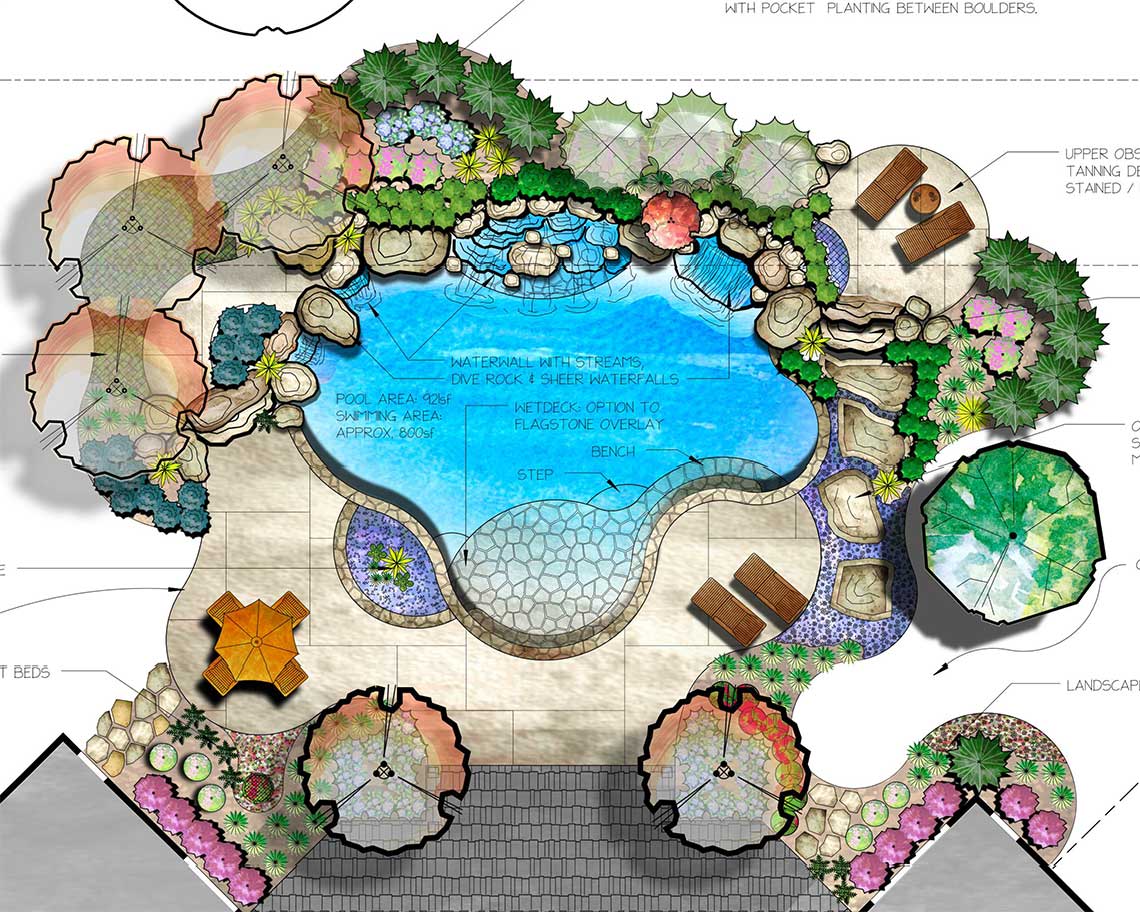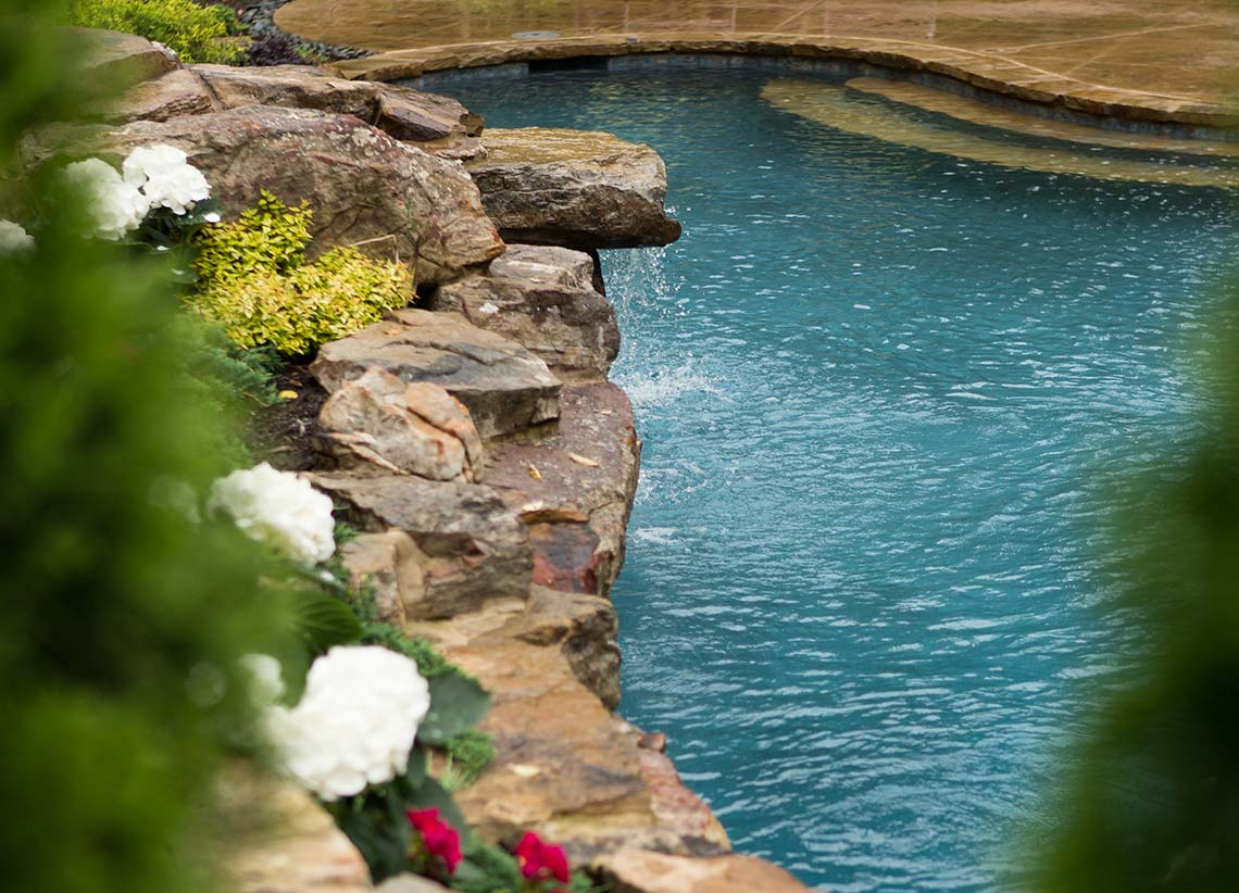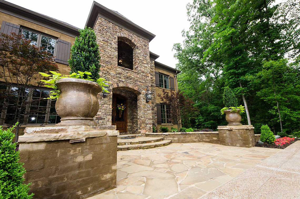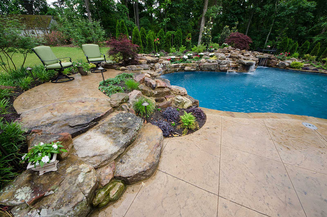 After several months of designing, meetings and more design time, the final master plan was complete. Included in this master plan were: a natural inviting design for vehicular access for the residents, guest parking with easy accessibility to the front entry, a well defined front entry, retaining walls to protect the wooded vegetation while still allowing the space needed for vehicular access, lush natural landscaping, irritation system for the entire property and elegant landscape lighting….and this was just the front yard. In the backyard, the design was to incorporate the natural topography of the site and include a custom pool with waterfalls (6 in total to be exact), plenty of pool deck area for entertaining, a private overlook bistro patio, plenty of rich green lawn space for the kids (their two black labs) and the grandchildren. The plan was also to include a grand entry into the landscape that had plenty of wow factor yet remaining in balance to the properties natural environment. Elegant landscape lighting brings this backyard paradise to life in the evening hours making this backyard the perfect outdoor entertainment location.