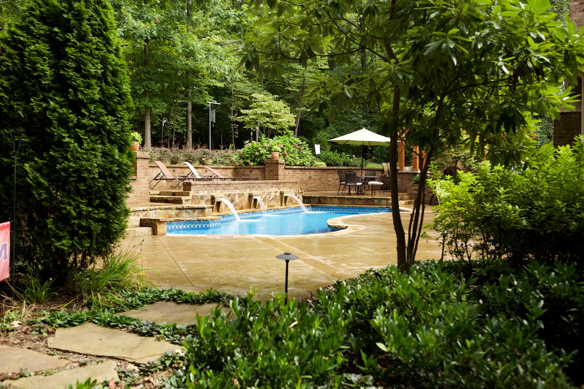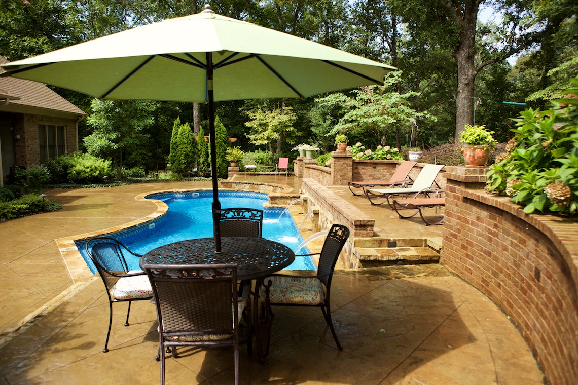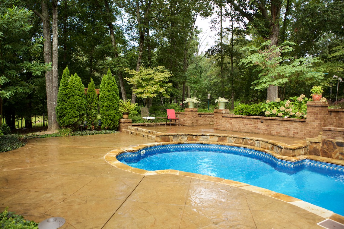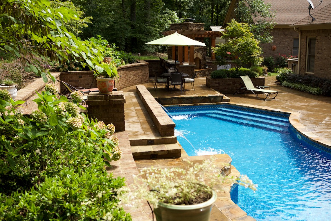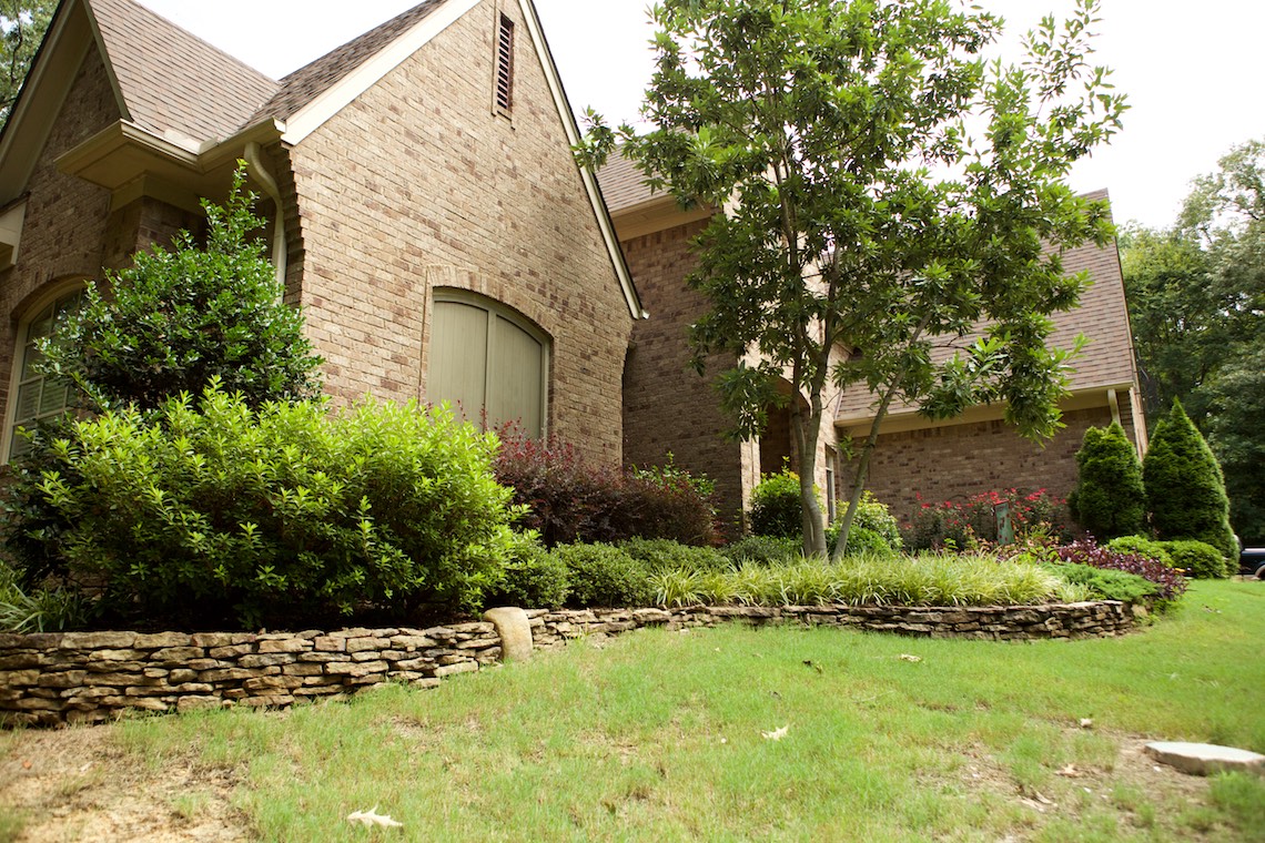 Located in a private rural area of Nesbit, Ms, this project is a perfect example of implementing a Master Plan over a period of phases. This project also provides an excellent example of maximizing one’s budget to accomplish the desires and wish list a client may have. The overall Master Plan for this property included a front landscape makeover including a water feature, landscaping, stone planter walls to accommodate grade change, an irrigation system and lighting system all to be installed as the first the phase of the overall Master Plan. The backyard presented a more challenging canvas for design and construction. Prior to the work in the back yard, the original grade sloped upward away from the house leaving the owners with an unattractive swale (or ditch) in the middle of the back yard. There were no usable spaces and drainage issues left the back yard wet, muddy and a haven for mosquitoes. The client’s dream backyard as presented to us included a custom pool, ample deck space for lounging and entertaining, an outdoor fireplace and kitchen, an intimate space for a hot tub and natural landscaping to blend into the properties wooded habitat.