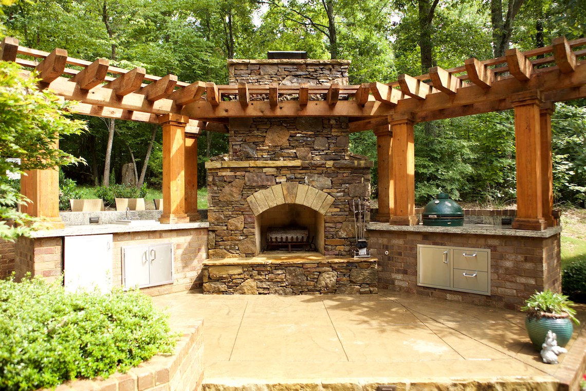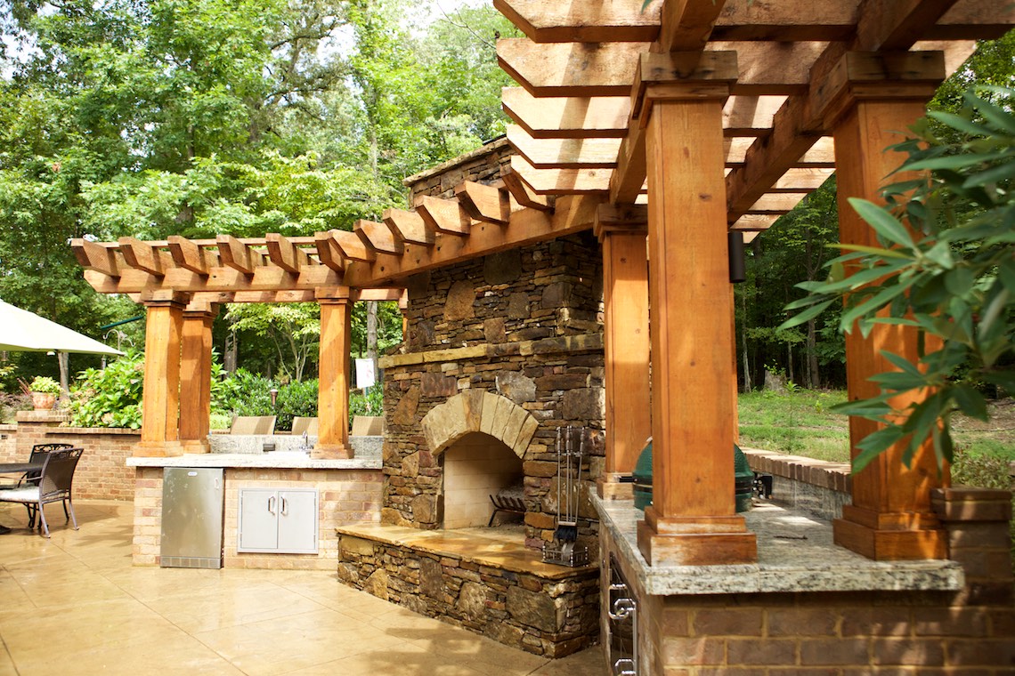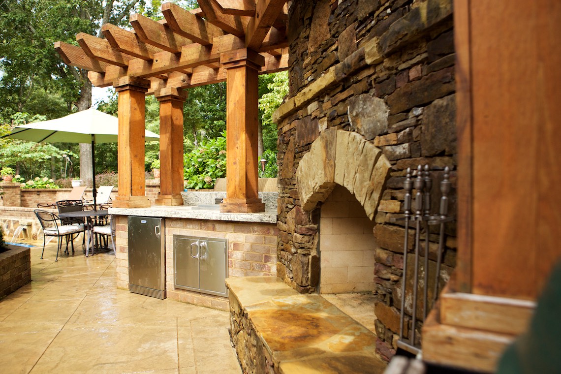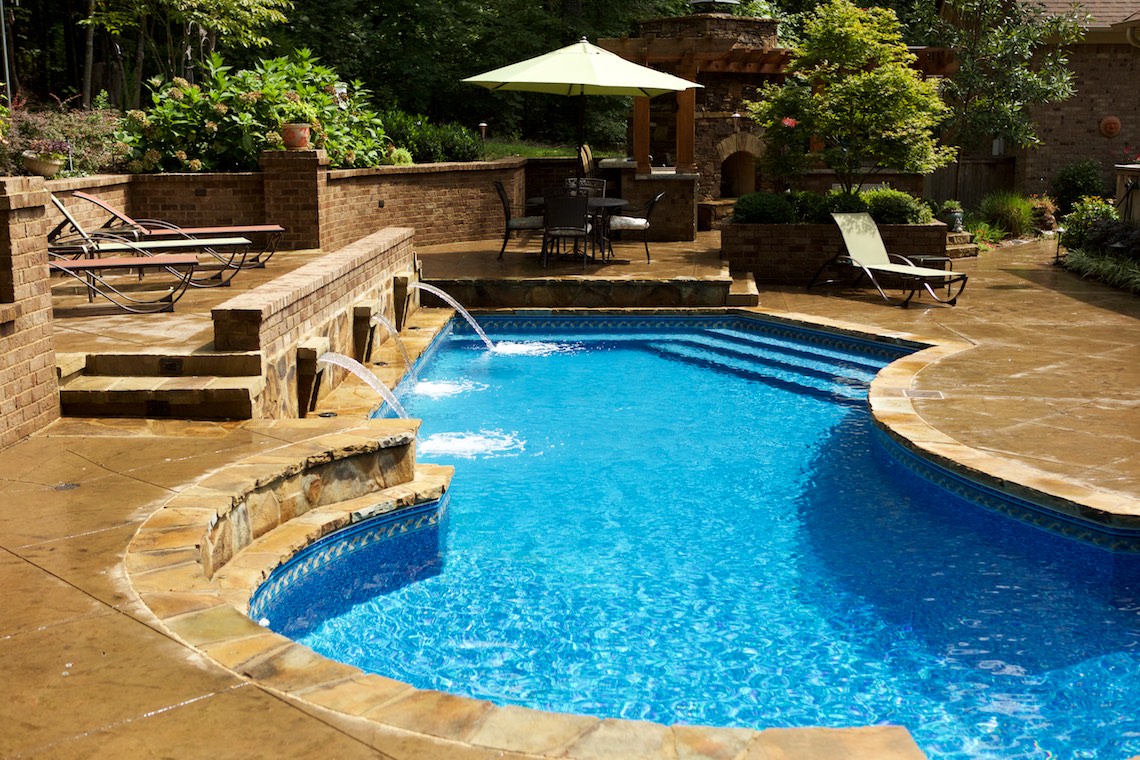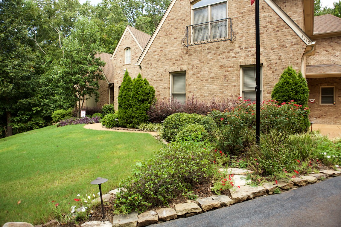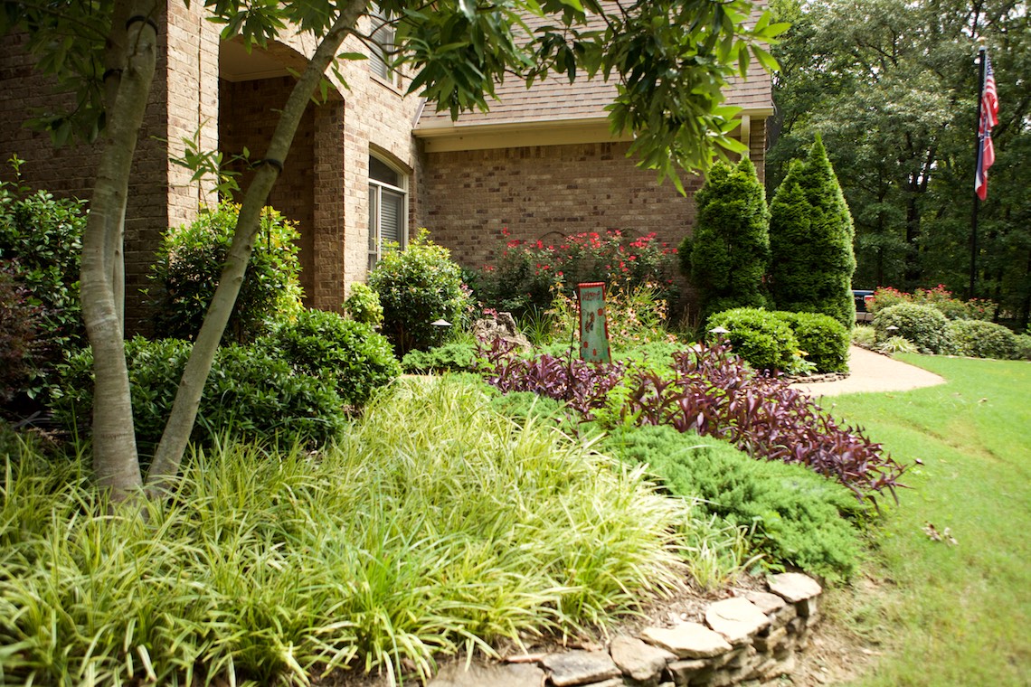 Located in a private rural area of Nesbit, Ms, this project is a perfect example of implementing a Master Plan over a period of phases. This project also provides an excellent example of maximizing one’s budget to accomplish the desires and wish list a client may have. The overall Master Plan for this property included a front landscape makeover including a water feature, landscaping, stone planter walls to accommodate grade change, an irrigation system and lighting system all to be installed as the first the phase of the overall Master Plan. The backyard presented a more challenging canvas for design and construction. Prior to the work in the back yard, the original grade sloped upward away from the house leaving the owners with an unattractive swale (or ditch) in the middle of the back yard. There were no usable spaces and drainage issues left the back yard wet, muddy and a haven for mosquitoes. The client’s dream backyard as presented to us included a custom pool, ample deck space for lounging and entertaining, an outdoor fireplace and kitchen, an intimate space for a hot tub and natural landscaping to blend into the properties wooded habitat.