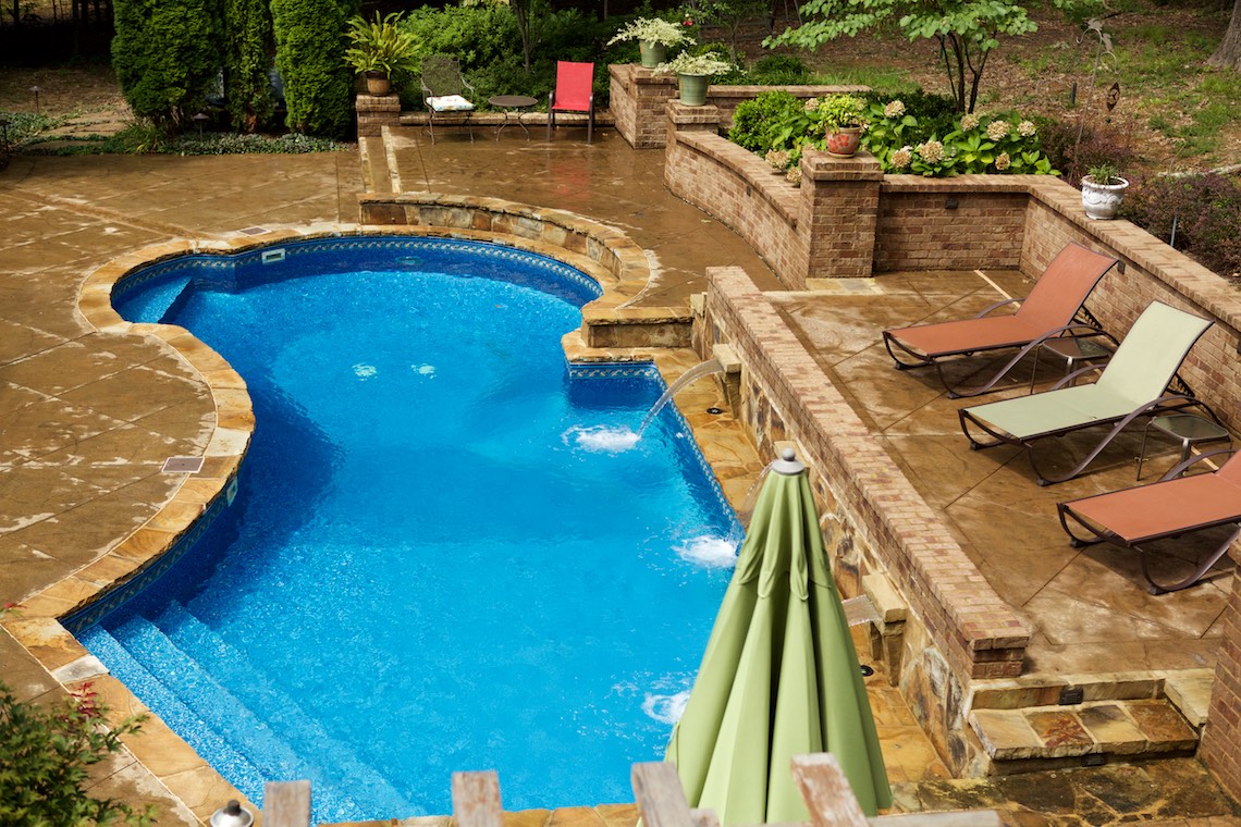 Despite the sites challenging conditions, we were able to successfully implement the desires of the clients into a beautiful backyard oasis. Originally designed as a custom gunite pool project, revisions were made to the plan changing the pool to a vinyl liner. Still custom in design, this provided room in the budget to construct the outdoor fireplace and kitchen dinning area. The intimate secluded hot tub space is convenient to access but screened from the main viewing area by lush landscaping and planters. The pool deck is multi level with a private tanning ledge tucked into the hillside. Protected by the planter walls and screened by the waterfall wall, this area disappears into the landscape behind it. The outdoor fireplace and kitchen with bar counter seating provides extended entertainment area and is neatly tucked into the landscape. This property is also maintained by Camp Creek Landscape.